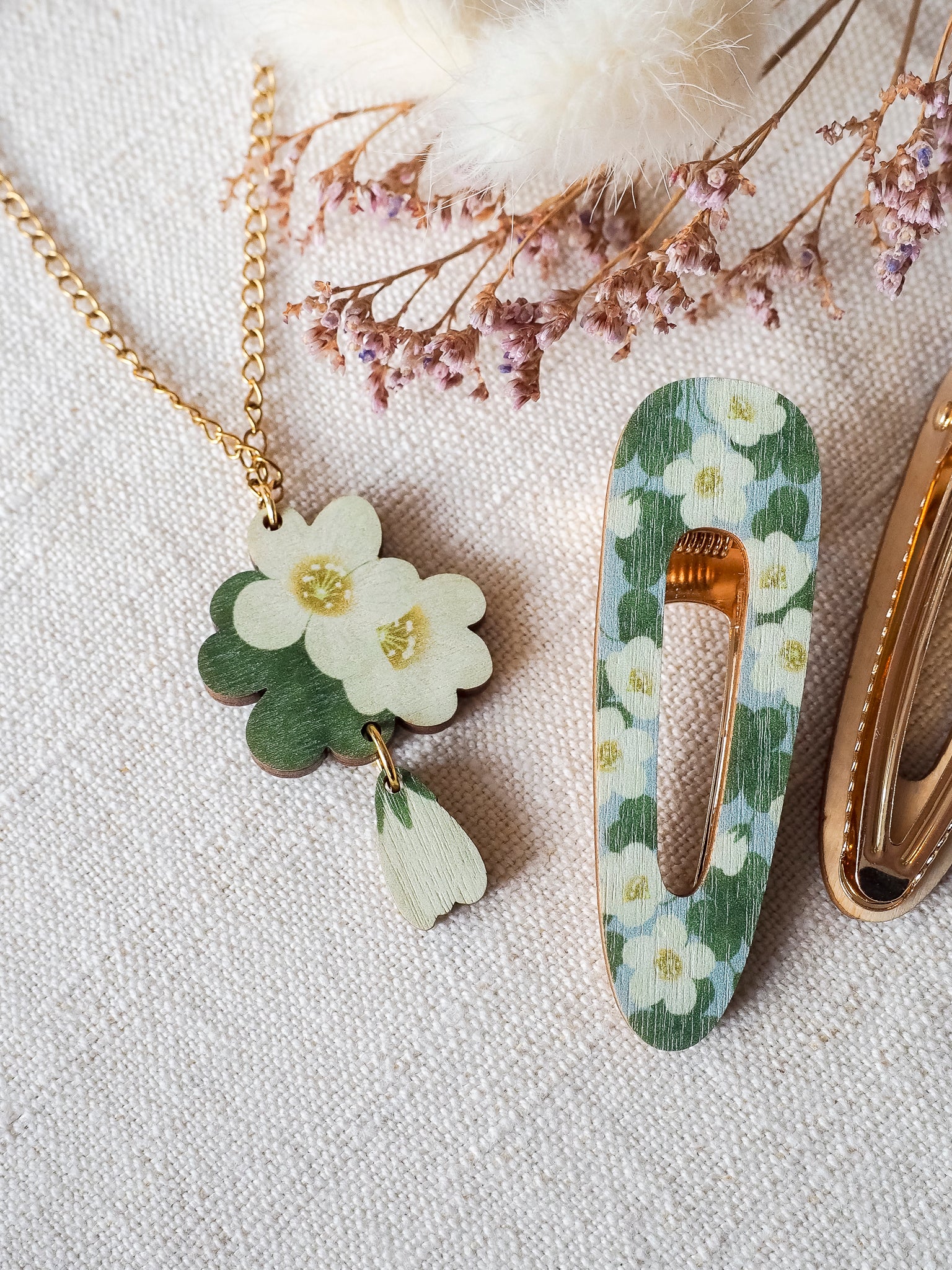 Saima Visualsin korut ja hiuspinnit on suunniteltu ja valmistettu Suomessa, ja niillä on Design from Finland ja Avainlippu -merkit.