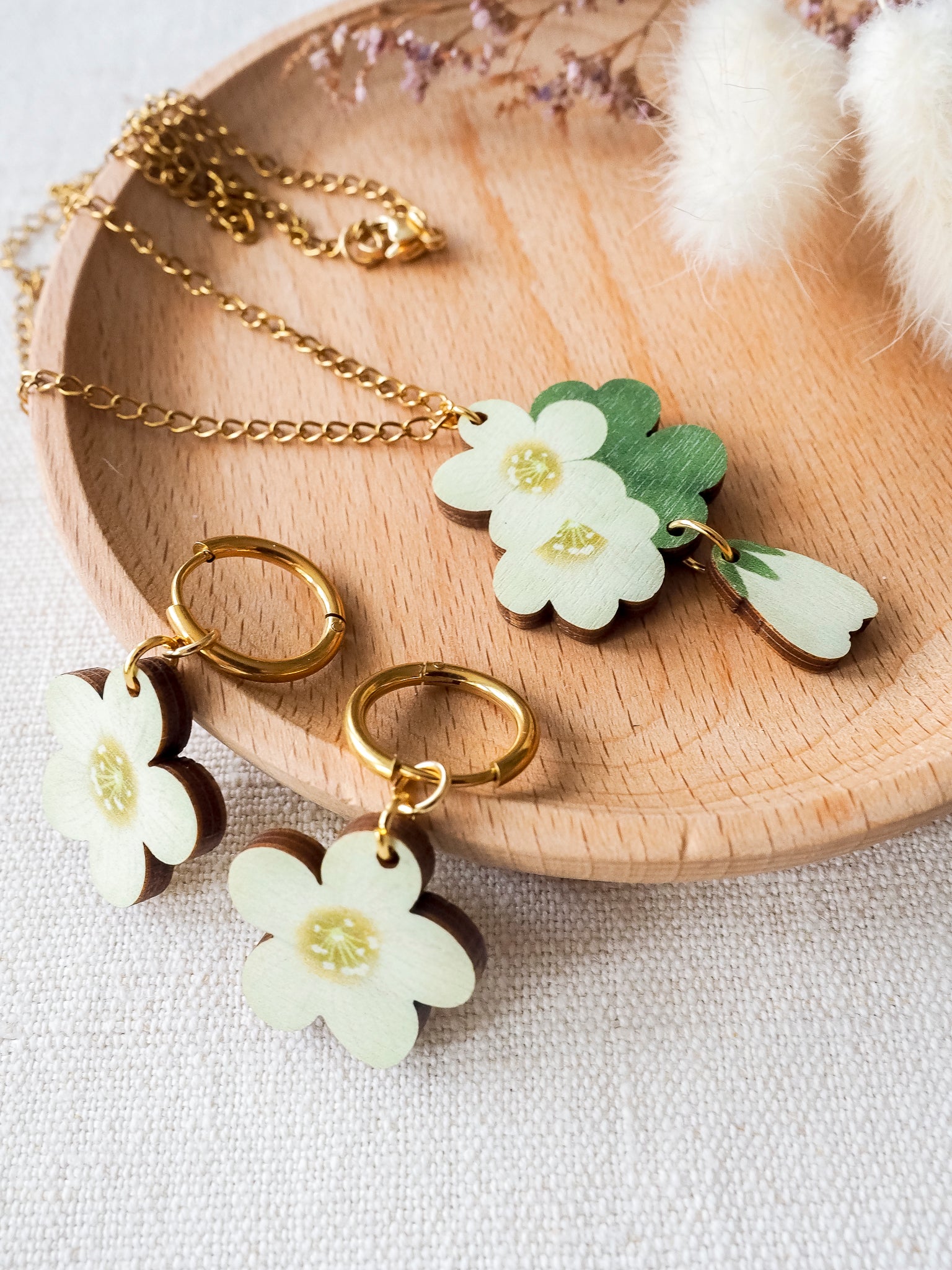 Riipus on valmistettu sertifioidusta kotimaisesta koivuvanerista ja sen koko on n. 25 x 40 mm. Kaulakorun ketju on valmistettu 18k PDV-kullatusta kirurginteräksestä ja se on 60 cm pitkä.